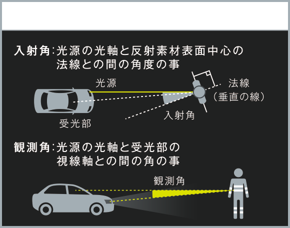 再帰性反射素材にはビーズ式とプリズム式があります。主に薄暮時から夜明にかけて、ヘッドライトによって再帰反射し識別性を発生させるものです。下図の反射輝度図上で定められた範囲内の数値が必要です。再帰性反射素材の性能は、下図のようにヘッドライトと作業員に角度が生じても遠距離から識別できることが求められます。また反射輝度の他にも摩耗や曲げ・低温での曲げ・洗濯耐久などの物性面の規定もあります。