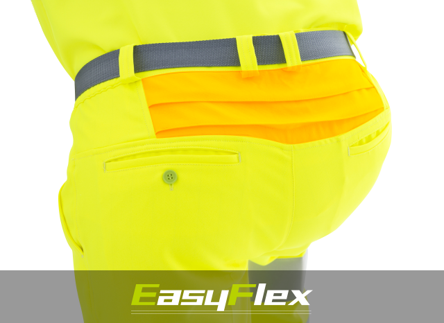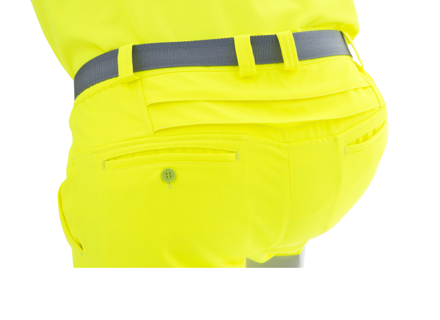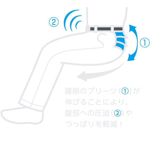 しゃがんだ際にプリーツが伸びることにより、背中やインナーウエアが見えにくくなりました。また、後腰部に伸縮メッシュを施すことで、前後や斜めの屈伸の動きをスムーズに。従来のパンツに比べ腹部への圧迫や引きつれも軽減する仕様です。