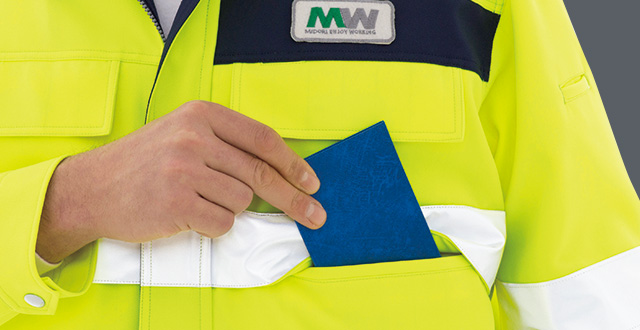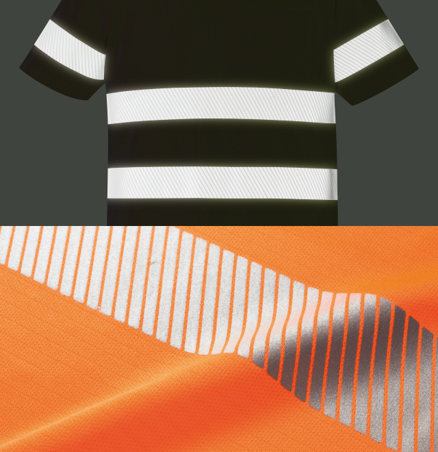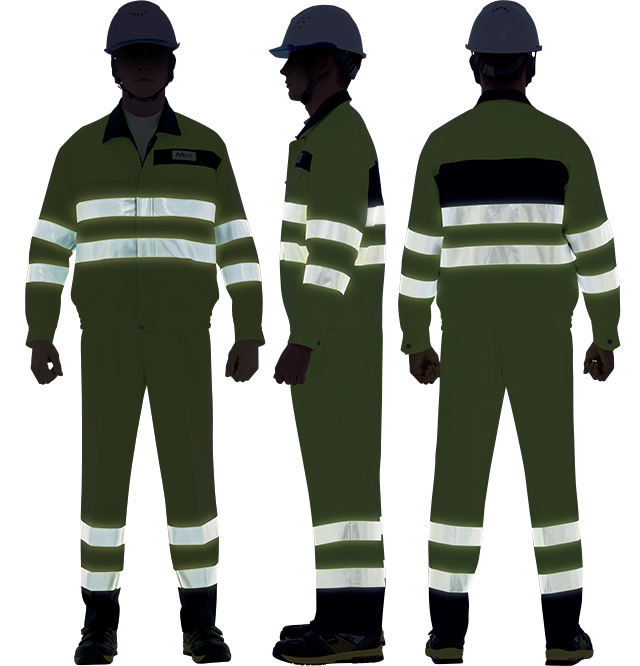 夜間作業の安全性を考慮して、腕、胸、腰、膝にリフレクター (高性能再帰性反射テープ) を採用し着用者のあらゆる動きに対し全方向から認識可能な設計になっており、強力な反射光で着用者の存在を知らせ、安全性を高めています。