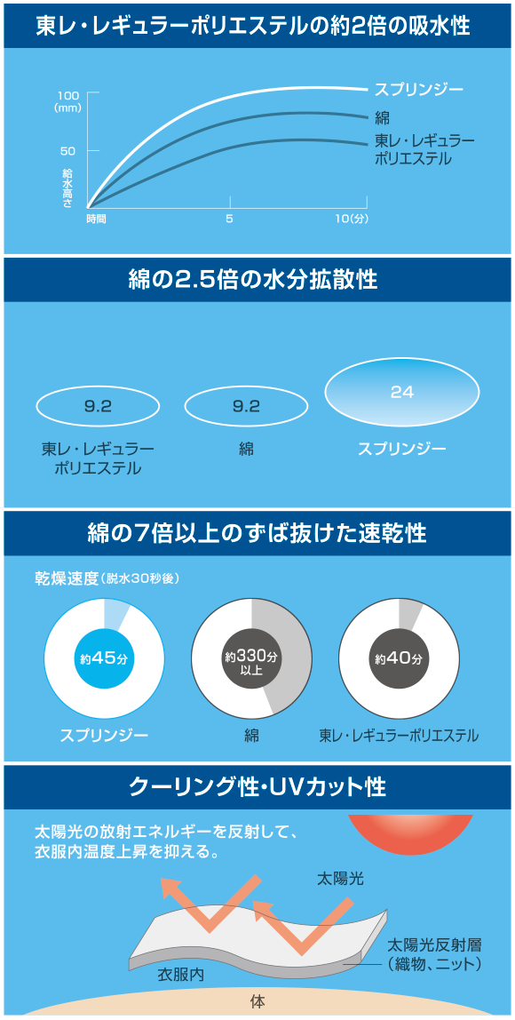 微細な溝を持つ異形断面と丸断面の単繊維をランダムに配列させてできた、数μm~10数μmの隙間を利用した毛細管構造のポリエステル糸。優れた通気性に加え、高い吸水性と拡散性を実現しました。さらに、セラミックを練り込んだ特殊ポリマーを使用しているため、透け防止効果、紫外線ガード性能、クーリング効果などの機能をあわせもつ素材です。
