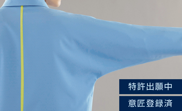 生地表面の電気抵抗値を抑えるには、縫製箇所を最小限にすることがポイントです。そこで、背中の中心1本で縫製するなど、ウエアの構造から新開発。ワーキングウエアとしての機能性を保ちながら、スマートなシルエット、動きやすさを実現しました。