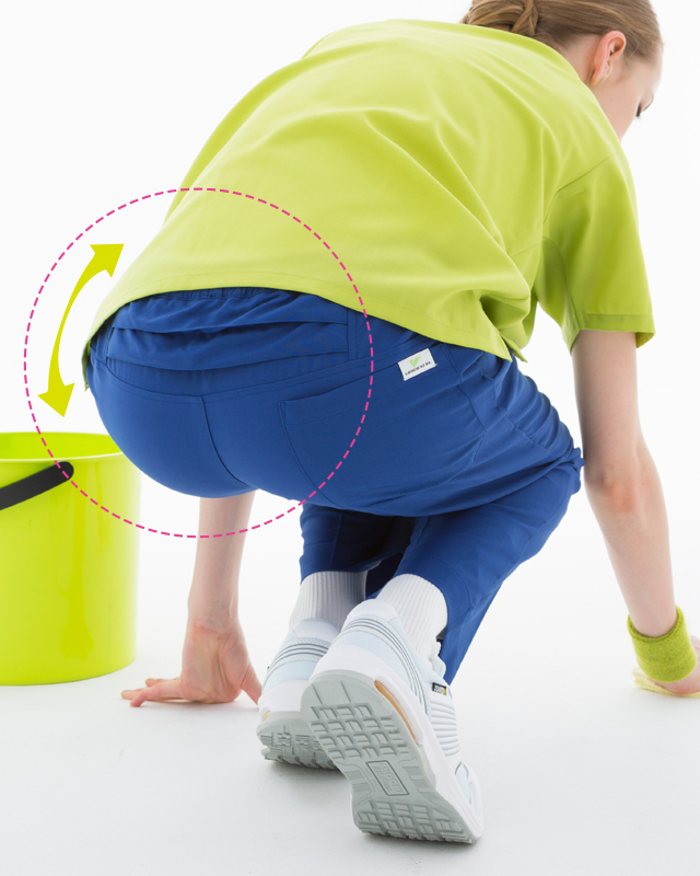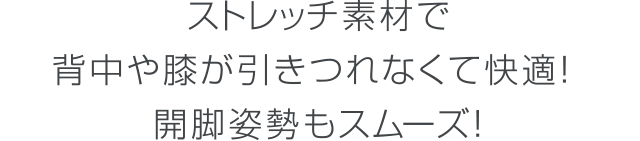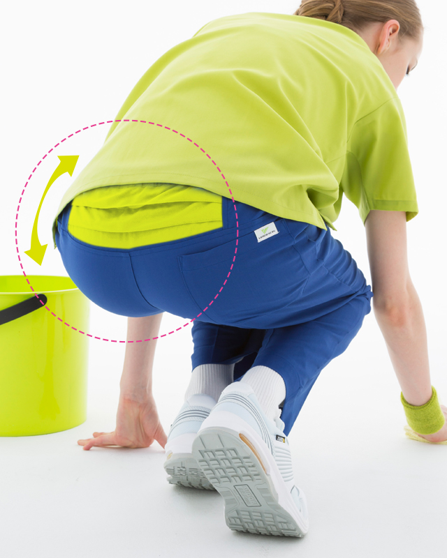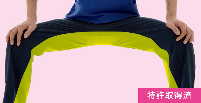 開脚運動をサポートするマチを股下部分に入れることにより、開脚姿勢をとった際の引きつれを防止し、快適に作業を行うことができます。