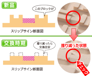 そのうち、2カ所以上の凸部分がスリップサインと同じ高さまですり減ったら交換時期になります。