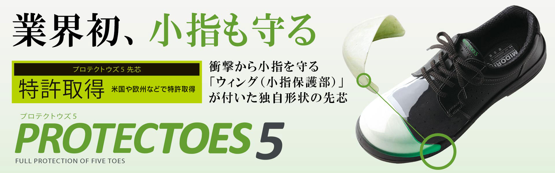 作業現場での台車の踏み付けによる、足の小指の障害事故は少なくありません。ミドリ安全は小指も保護できる業界初の先芯「プロテクトウズ5」を開発!米国や欧州などで特許取得。衝撃から守る「ウィング(小指保護部)」が付いた独自形状の先芯を使用。安全の基準を超えたイノベーションテクノロジーです。