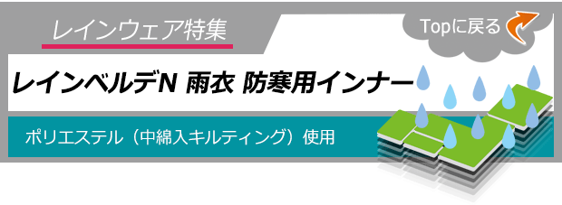 レインベルデN 雨衣 防寒用インナーは、ポリエステル(中綿入キルティング)使用。冬場のレインウェアのインナーにおすすめ! しっかりバッチリ内側から防寒対策が可能。