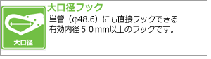 | 特徴 | ●本体:緊張器+台付けロープ ●各種高所作業現場(ビル建設工事・橋梁・ダム・土木建設工事・塗装工事・造船所など)において、墜落制止用器具取付用の水平親綱および手すりとして使用できます。 ●シノやレンチなどを使って親綱を簡単に強く張ることができます。また緩めることも簡単です。 ●大口径フック(FS−90)付きで、直径50mm以下の単管パイプに直接掛かります。 |