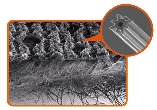 | 特徴 | 中綿と裏地が一体化したハイテク素材「Octa(R)CPCP(R)」使用 ●軽量性:同じ直径の丸い断面のポリエステル繊維と比べると、わずか2分の1程度という驚異的な軽さ ●保温性:中空部と8本の突起部に含まれるデッドエアーにより優れた保温性を発揮します ●吸汗速乾性:水や汗が通りやすく、サラッとした快適な着心地で、表面積が多いため速乾性に優れています |