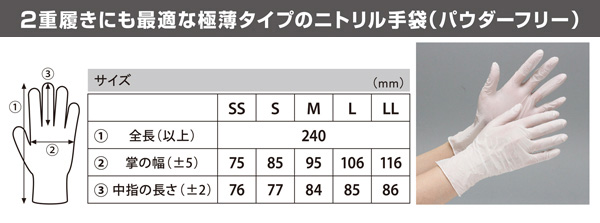 | サイズ・寸法 | Lサイズ ●全長:240mm ●掌の幅:106(±5)mm ●中指の長さ:85(±2)mm |