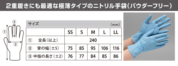 | サイズ・寸法 | SSサイズ ●全長:240mm ●掌の幅:75(±5)mm ●中指の長さ:76(±2)mm |